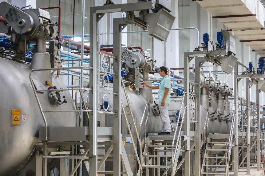 目前,新園區(qū)的染色設(shè)備是O型和L型染色機(jī),設(shè)備的自動化水平比較高。企業(yè)正在加快建立印染控制管理系統(tǒng),從單一裝備的數(shù)控化向整個(gè)車間的智能化轉(zhuǎn)變。