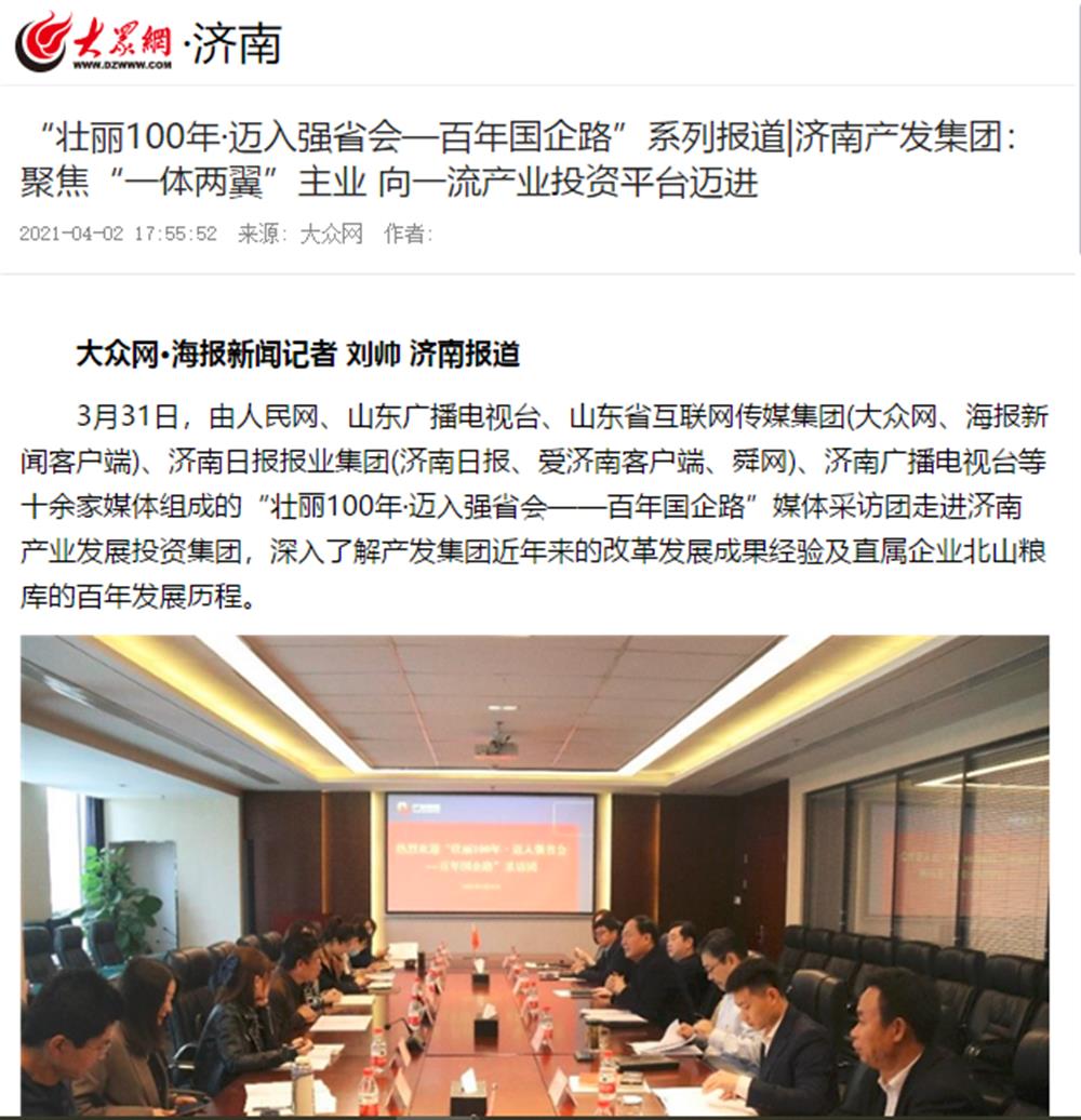 近日,市國(guó)資委舉辦的“壯麗100年·邁入強(qiáng)省會(huì)——百年國(guó)企路”媒體團(tuán)一行到訪濟(jì)南產(chǎn)發(fā)集團(tuán)后,人民網(wǎng)、大眾網(wǎng)、閃電新聞、濟(jì)南電視臺(tái)、濟(jì)南日?qǐng)?bào)、帶濟(jì)南等多家國(guó)家、省市級(jí)媒體聚焦報(bào)道了集團(tuán)改革發(fā)展的成果經(jīng)驗(yàn)。